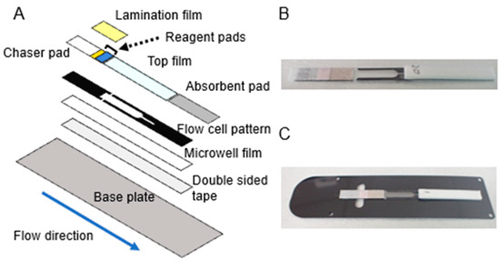 The structure and representative images of the D-strip flow cell are shown in Figure 1. Double-sided tape 100 µm thick was custom manufactured (CSTEC corporation, Kyoto, Japan) from 50 µmthick black polyethylene terephthalate (PET) film (TORAY, Tokyo, Japan, Lumirror® #50-X30) and 25 µmthick glue (3M, Alexandria, MN, USA, 9969) and shaped by a laser cutter to the form shown in Figure 1A. The flow cell outlet was coated with 1% (v/v) Tween-20 (Fujifilm Wako Pure Chemical, Osaka, Japan) and dried in ambient conditions for 10–15 min before lamination. Double-sided tape was stacked on a film-formed microwell array, which was manufactured by Sumitomo-Bakelite (Tokyo, Japan) from cyclo-olefin polymer (COP), coupling the COP backing with the other materials: chaser pad (Merk, Rahway, NJ, USA, GFDX), reagent-coated pads, hydrophilic transparent film (3M, Alexandria, MN, USA, 9901P) and absorbent (Cytiva, Marlborough, MA, USA, CF7). All pads were laminated using a single-side polypropylene tape (3M, Alexandria, MN, USA, 9793R) while keeping a small section of the sample pad bare for the sample application, as shown in Figure 1. The assembled serial strip was divided into single strips using a die cutter powered by a hand press machine (Road planning, Gunma, Japan, RV-2000). The single strip (Figure 1B) was adhered onto a 250 µmthick black PET film baseplate (custom fabricated by TORAY, Tokyo, Japan using Lumirror® X30#250 by CSTEC, Kyoto, Japan) via double-sided tape (3M, Alexandria, MN, USA, 9965) (Figure 1C).