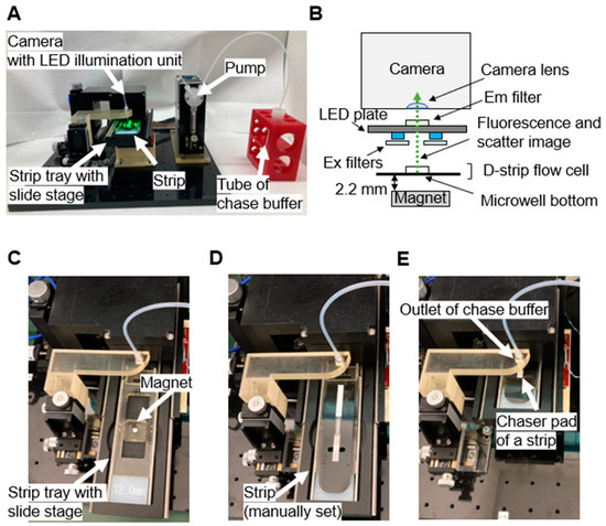 Assay and imaging system for the D-strip assay: (A) Photo of the system. D-strip’s system mainly contains a camera system with an LED illumination unit, stirp tray, and pump to perform programmed injection of chase buffer onto the strip after a given time during an assay. (B) Schematic of the optical system, D-strip flow cell placement, and magnet alignment. The D-strip flow cell is secured on a tray. The camera is focused on the microwells of the D-strip flow cell, with the LED plate (blue and green) illuminating the flow cell. The fluorescent solution in the microwell is excited by the blue LED through the excitation (Ex) filter, while the beads in the microwell are illuminated by the unfiltered green LED. The fluorescence emission and scattering images from the microwell are directed to the camera lens through the top film of the D-strip and the emission (Em) filter. The schematic is not to scale. (C–E) Photos of the system with an open, empty strip tray (C), an open strip tray loaded with a strip (D), and a closed strip tray loaded with a strip (E). A neodymium magnet was placed on the strip tray to load beads into the microwells during the D-strip assay.