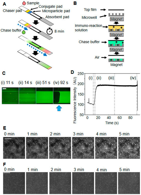 A schematic of the D-strip assay is shown in Figure 3A. An assay was initiated by injecting a sample solution into the chaser pad, which rehydrated the reagents in the pads. Then, the sample solution was diffused to the adjacent conjugate pad. Next, dissolved conjugates migrated along with the sample solution to the downstream particle pad. Following the rehydration of the dried, coated microparticles by the sample solution containing alkaline phosphatase (AP)-labeled antibodies, an immunoreaction between the sample, conjugates, and microparticles occurred on the pad. A polypropylene tape laminate over the reagent pads (Figure 1A) ensured proper liquid flow, directing the applied solution from the chaser pad through the reagent pads to the flow cell, preventing bypass flow. After an immuno-reaction time of 8 min, a chase buffer was applied to the chaser pad, which pushed the immuno-reaction solution into the adjacent flow cell. As the sample solution passed the flow cell, the floating magnetic particles were attracted by the magnet located under the strip, and the particles were trapped in the microwell array (Figure 3B). Excess conjugate and sample solution were washed away by the flow of the chase buffer. The influx of the chase buffer was indicated by fluorescence emission from the pyranine–phosphate present in the chase buffer (Figure 3C,D). As the flow reached the edge of the channel, the sample and then eventually the chase buffer were absorbed by the absorbent pad, decreasing the green fluorescence emission (Figure 3C(iv),D) and indicating the onset of enzyme reactions in the microwells. The process of injection to the depletion of chase buffer took about 1 min (Figure 3C,D). To guarantee efficient liquid absorption from the flow cell to the absorbent pad, Tween-20 was coated on a microwell film between the flow cell outlet and the absorbent pad. In the isolated microwells containing the ternary complex of conjugate, mP) and antigen, pyranine–phosphate in the chase buffer was cleaved into pyranine by AP on the conjugate, producing pyranine’s green fluorescence emission. In microwells without the ternary complex, no green fluorescence was generated. As a result, the microwells filled with chase buffer exhibited a time-dependent increase in bright fluorescent spots as the enzyme reaction progressed in positive samples (Figure 3E), while only a limited number of bright fluorescent spots were observed in negative samples (Figure 3F).