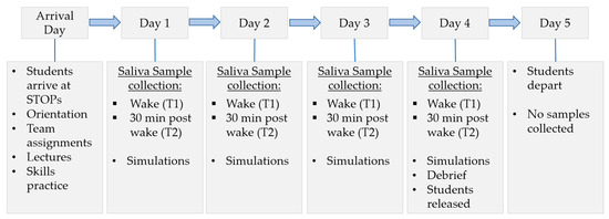 - Crouse Flesch, M.; Shannon, A.; Peterson, T.; Puri, K.; Edwards, J.; Cooper, S.; Clodfelder, C.; LaPorta, A.J.; Gubler, K.D.; Ryznar, R. Objective Response of Saliva Biomarkers After High-Stress and Mass Casualty Scenarios: A Pilot Study. J. Surg. Res. 2024, 302, 533–539. [Google Scholar] [CrossRef] [PubMed]