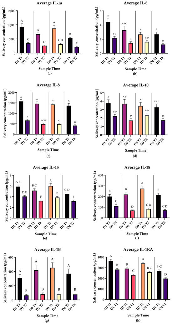 - Parkin, G.M.; Kim, S.; Mikhail, A.; Malhas, R.; McMillan, L.; Hollearn, M.; Granger, D.A.; Mapstone, M.; Yassa, M.A.; Thomas, E.A. Associations between Saliva and Plasma Cytokines in Cognitively Normal, Older Adults. Aging Clin. Exp. Res. 2023, 35, 117–126. [Google Scholar] [CrossRef] [PubMed]