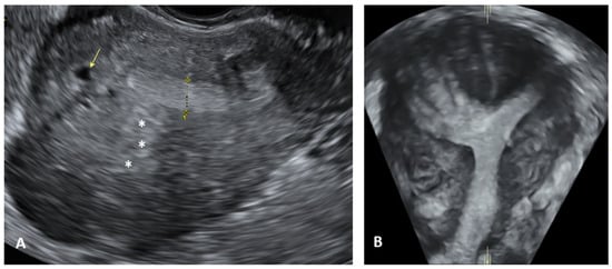 Transvaginal ultrasound (TVS) appearance of adenomyosis. (A) Two-dimensional (2D) TVS evaluation shows direct diagnostic signs: myometrial cystic areas (yellow arrow), hyperechoic foci (with asterisks); (B) Three-dimensional (3D) TVS evaluation of adenomyosis shows a diffuse undefined junctional zone.
