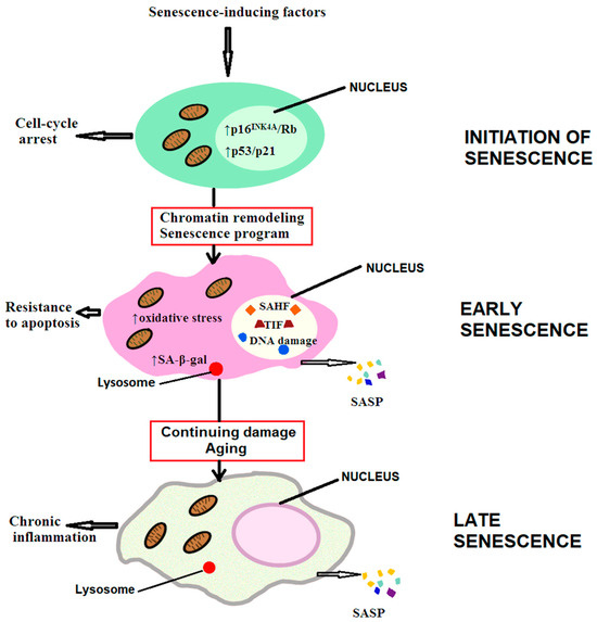 - Impairment of the lysosomal autophagy system and expansion of the lysosomal content, allowing the detection of senescence-associated β-galactosidase (SA-β-gal).