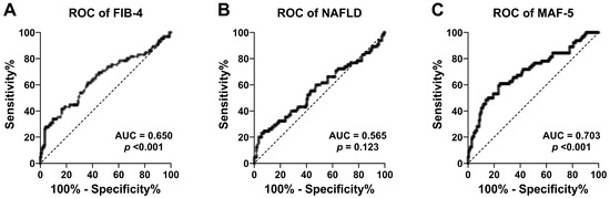 - Huang, C.F.; Liang, P.C.; Wang, C.W.; Jang, T.Y.; Hsu, P.Y.; Tsai, P.C.; Wei, Y.-J.; Yeh, M.-L.; Hsieh, M.-Y.; Lin, Y.-H.; et al. Performance of non-invasive seromarkers in predicting liver fibrosis among MAFLD patients with or without viral hepatitis. Kaohsiung J. Med. Sci. 2024, 40, 374–383. [Google Scholar] [CrossRef] [PubMed]