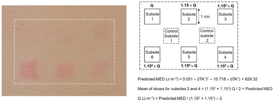 The ‘predicted MED’ values for UVR calculated from the skin color parameter ITA° are shown in Table 2. Six doses of UVR selected based on the ‘predicted MED’ were irradiated to six subsites of the test skin site in each subject.