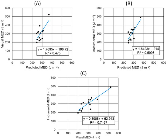 The simple linear regression analysis between the ‘predicted MED’, ‘visual MED’, and ‘instrumental MED’ values for UVR in human subjects. Scatter plots of the ‘visual MED’ versus ‘predicted MED’ (A), ‘instrumental MED’ versus ‘predicted MED’ (B), and ‘instrumental MED’ versus ‘visual MED’ values (C) are shown. A blue trend line, equation, and determination coefficient (R2) are shown in each scatter plot.