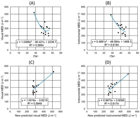 Development and validation of the new second-order equations predicting the visual and instrumental MED values from ITA° values. Scatter plots of the ‘visual MED’ versus ITA° (A), ‘instrumental MED’ versus ITA° (B), ‘visual MED’ versus ‘new predicted visual MED’ (C), and ‘instrumental MED’ versus ‘new predicted instrumental MED’ values (D) are shown. A blue trend line, equation, and determination coefficient (R2) are shown in each scatter plot.