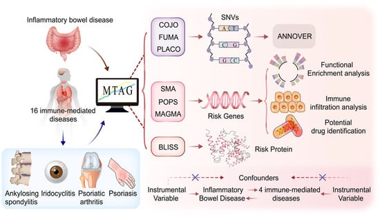 Based on the results of the abovementioned analyses, the multi-trait analysis of GWASs (MTAG) method was used to assess the phenotypes of immune-mediated diseases that exhibited a significant genetic correlation with META-IBD. The MTAG involves the use of the generalized inverse-variance weighted (IVW) approach to enhance statistical power and facilitate the identification of genetic relationships for each trait. Essentially, the MTAG processes the GWAS summary data of individual traits to produce trait-specific effects for shared SNPs while integrating LDSC to adjust for sample overlap between related traits []. In this process, the GWAS data of immune-related disease phenotypes with confirmed genetic correlations to IBD were integrated to generate MTAG-IBD.