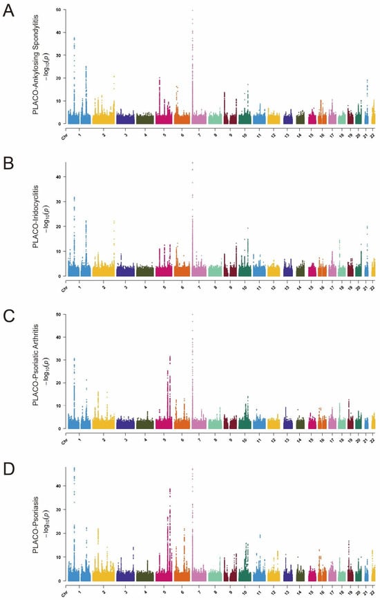 Manhattan plots of gene-based enrichments of PLACO associations with (A) ankylosing spondylitis, (B) iridocyclitis, (C) psoriatic arthritis, and (D) psoriasis. The x-axis shows chromosomal position, and the y-axis shows association p-values on a −log10 scale.