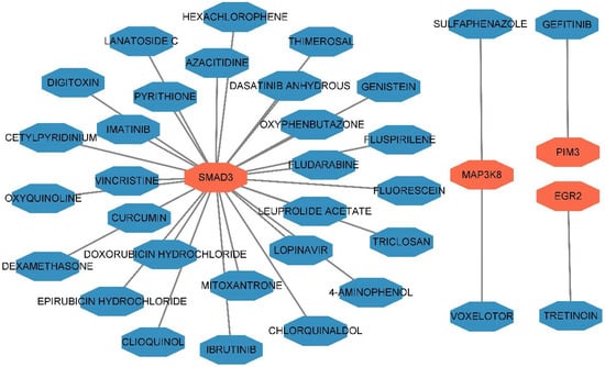 Cytoscape was used to construct a drug–gene interaction network (Figure 4 and Supplementary Table S12). A total of 32 interactions were observed between 32 small-molecule drugs and 4 pleiotropic genes (MAP3K8, EGR2, PIM3, and SMAD3), which may represent novel therapeutic targets for IBD.