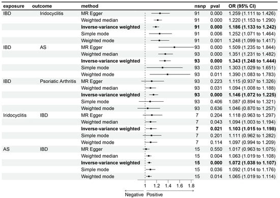 Bidirectional MR was performed to investigate the potential causal relationship between IBD and immune-mediated diseases. The results indicate a potential causal relationship between META-IBD and iridocyclitis [OR: 1.19; 95% CI: 1.13–1.24], AS [OR: 1.34; 95% CI: 1.25–1.44], and PsA [OR: 1.15; 95% CI: 1.07–1.22], with increased incidence rates. Reverse MR demonstrates that iridocyclitis [OR: 1.10; 95% CI: 1.02–1.20] and AS [OR: 1.07; 95% CI: 1.04–1.11] have an inverse causal relationship with the incidence of META-IBD (Figure 5). Scatter plots, funnel plots, and leave-one-out sensitivity analysis are represented in Figure 6 (Supplementary Tables S13 and S14).