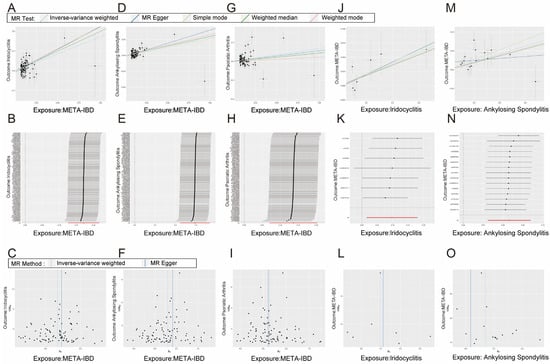 The scatter plot (A,D,G), sensitivity analysis (B,E,H), and funnel plot (C,F,I) of the effect of ankylosing spondylitis, psoriasis, and iridocyclitis on META-IBD. The scatter plot (J,M), sensitivity analysis (K,N), and funnel plot (L,O) of the effect of META-IBD on iridocyclitis and ankylosing spondylitis. In the scatter plot, five methods were employed to describe the direction of causality: IVW, Weight median, Simple Mode, Weighted Mode, and MR Egger.