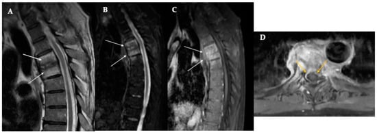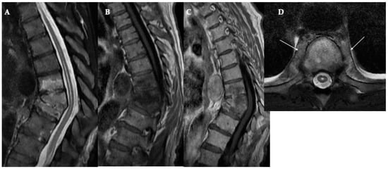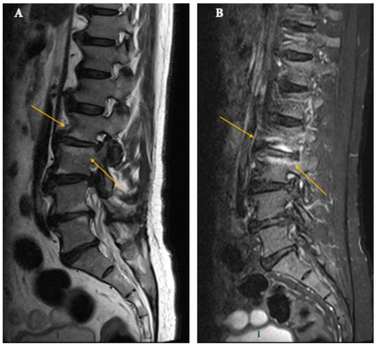 MR is the most sensitive imaging technique for the diagnosis of a spinal infectious disease; usually, it is performed with T1- and T2-weighted sequences, on the sagittal and axial planes. The coronal plane can be useful for a more precise evaluation of paravertebral spaces (in the study of the involvement of the psoas muscles, for example). The protocol should always include the fluid-sensitive sequences (such as fat-suppressed (FS) T2-weighted imaging or STIR) because they are highly sensitive in detecting small foci of edema at the initial stage of the disease. The administration of intravenous contrast agents is usually performed on the suspicion of a spinal infection; it improves the visualization of anatomical details and differentiation of phlegmon from epidural abscesses, which is essential because it guides the therapeutic options [18,19,20] (Figure 1).
