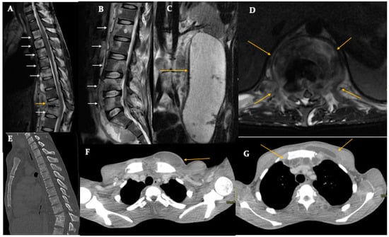 Sagittal fat-suppressed, T2-weighted imaging on the dorsal (A) and lumbar (B) spine shows multiple vertebral sites of infection (arrows) with signal changes in bone marrow and vertebral collapse (yellow arrow). Coronal (C) and axial (D) T2-weighted images show a wide collection in the paravertebral space (yellow arrows). A sagittal (E) CT scan and axial CT (F,G) show multiple fluid collection in the parasternal spaces (yellow arrows).