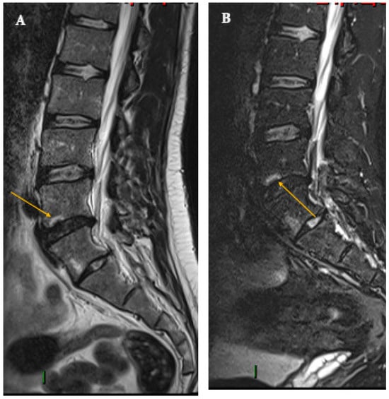 Type I Modic changes at L2–3 endplates showing a hyperintense signal (arrows) on an STIR image (A) and a T2-weighted image (B). The disc is characterized by degenerative changes, appearing reduced in height. There is no involvement of the surrounding paravertebral edema or psoas muscle.