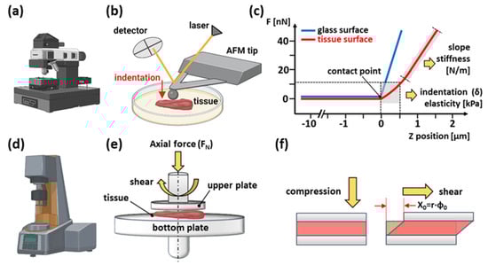 Schematic representation of two experimental settings. Rheological properties of vermiform appendix samples were tested using atomic force microscopy (a) and a shear rheometer (d). (b) Measurement visualization of Young’s modulus using AFM. The main AFM components are a cantilever with a spherical tip, a laser source, a photosensitive photodiode and a piezoelectric scanner for applying a normal force to soft tissue samples. (c) The compressive force applied as a function of a sample’s position in the Z-direction induces so-called force vs. distance curves. The difference between the AFM cantilever deflection on a stiff surface (blue curve) and the soft tissue (red curve) describes the deformation of the tissue under the load applied. This enables the determination of the sample modulus of elasticity (Young’s modulus). (e) Rheological experimental setup—the upper sandblasted 8 mm diameter parallel plate system. (f) Shear forces, in combination with sample compression, were applied by rotating the upper plate in a direction parallel to the sample. The deflection of the measuring plate by the angle φ was converted into shear deformation (figure was created with Biorender.com).