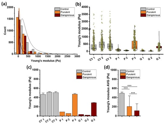 The Young’s modulus values obtained for control (CT), inflamed—purulent (P) and gangrenous (G) vermiform appendix using AFM indentation technique: (a) Young’s modulus distribution for control and inflamed tissues for all patients with a fitted probability density function of the log-normal distribution. (b) Young’s modulus distribution for each control (CT1–CT3), purulent (P1–P3) and gangrenous tissues (G1–G3) with a fitted probability density function of the log-normal distribution. (c) The mean values of tissues Young’s modulus ± standard deviation for each control, purulent and gangrenous tissue obtained from all force vs. distance curves. (d) The mean values (AVG) of tissues’ Young’s modulus ± standard deviation for each group of control and inflamed tissues. C1–C3—tissue samples excised from a single healthy appendix; P1–P3—tissue samples excised from three separate inflamed (purulent) appendices; G1–G3—tissue samples excised from three separate inflamed (gangrenous) appendices. Each sample was tested once. *** p ≤ 0.001.