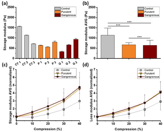Rheological properties of the control and inflamed vermiform appendix: (a) Storage modulus values (G’) for each control (CT1–CT3), purulent (P1–P3) and gangrenous tissues (G1–G3). (b) The mean values of tissues’ storage modulus ± standard deviation for each group of control and inflamed tissues demonstrated smaller elasticity of inflamed tissues compared to control ones. (c) The normalized (AVG) storage modulus of control and inflamed tissues as a function of axial strain (compression up to 40% of initial tissue height). The compression stiffening effect is visible for both control and inflamed tissues, but inflamed tissues stiffen to a greater extent. (d) The normalized (AVG) loss modulus values (G’’) of tissues are expressed as a function of axial strain. Inflamed tissue in compression reacts by increasing elasticity more prominently compared to healthy tissue. Inflamed tissues become more elastic at impressing compression. C1–C3—tissue samples excised from a single healthy appendix; P1-P3—tissue samples excised from three separate inflamed (purulent) appendices; G1–G3—tissue samples excised from three separate inflamed (gangrenous) appendices. Each sample was tested once. *** p ≤ 0.001.