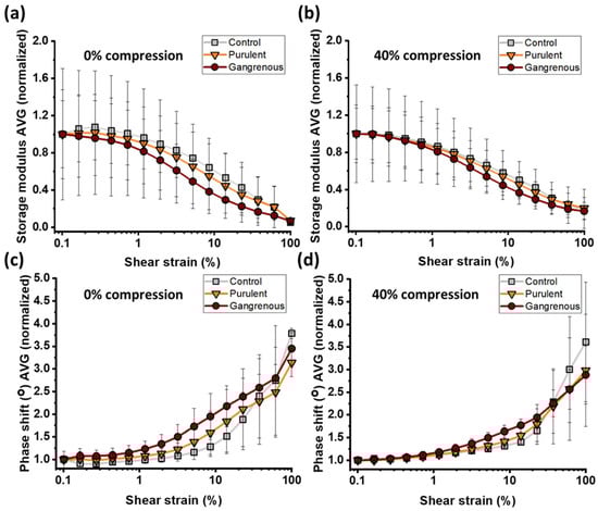 In the case of 40% compression, the storage modulus of control tissue samples increased by 200%. The appendix tissues with gangrenous inflammation were characterized by the highest increases in storage modulus in compression. Under compression, the storage modulus increased by almost 400% compared to uncompressed tissues. This increase was greater in the case of tissues with purulent inflammation, where the elasticity of the tissues under pressure increased by 350%. Increases in the compression loss modulus are also visible (Panel d). A higher increase was observed for inflamed appendix tissues, as in the case of storage moduli. The results of the dependence of tissue storage moduli as a function of shear strain (Figure 4a for 0% compression and Figure 4b for 40% compression) and phase shift angles (Figure 4c for 0% compression and Figure 4d for 40% compression) show differences in the behavior of control and inflamed appendix tissue, but the differences are not as clear as in the case of the stiffening phenomenon in compression.