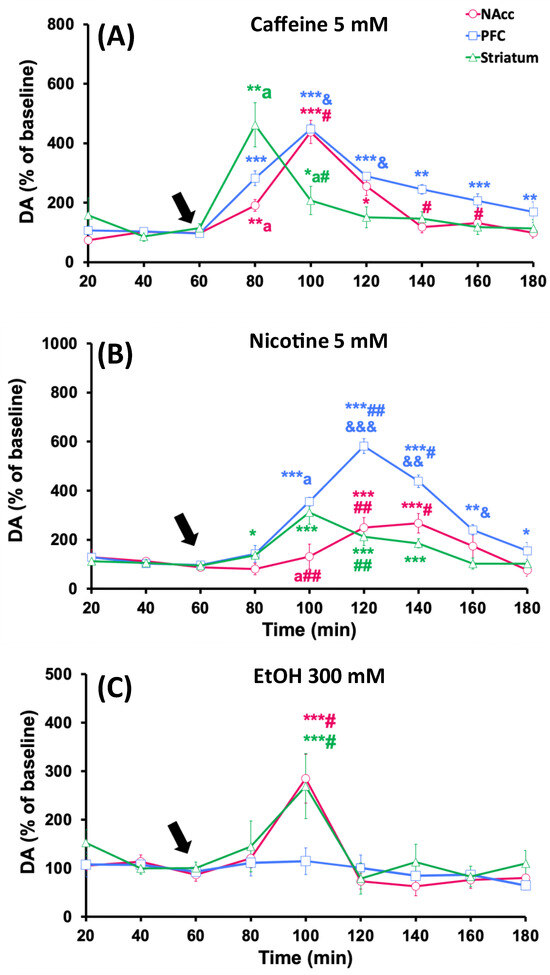 Effect of individual administration of caffeine (A), nicotine (B), and ethanol (C) on dopamine levels in the NAcc, PFC, and striatum of rats. Substances were perfused for 60 min starting from the time indicated by the arrow. Results are shown as mean ± S.E.M., expressed as a percentage of baseline levels (100%). Baseline levels were considered as the average of dopamine concentrations in the two samples collected before treatment administration. Significant differences: * p < 0.05, ** p < 0.01 and *** p < 0.001 with respect to basal levels; a p < 0.05 comparing NAcc vs. striatum; # p < 0.05 and ## p < 0.01 comparing NAcc vs. PFC; & p < 0.05, && p < 0.01 and &&& p < 0.001 comparing PFC vs. striatum.