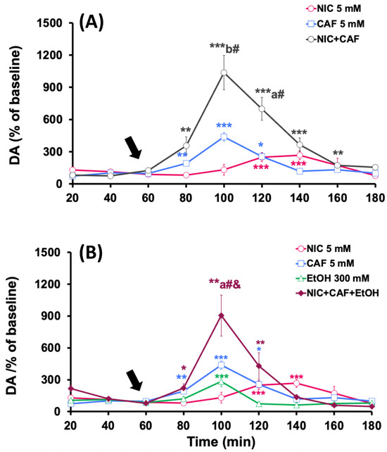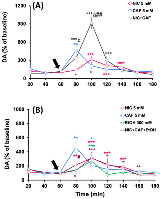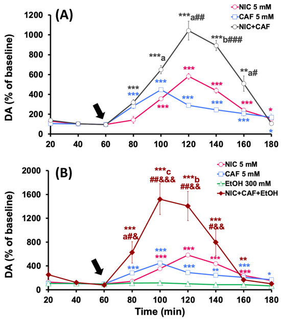 Effect of individual and combined administration of (A) nicotine (NIC) + caffeine (CAF) and (B) NIC + CAF + ethanol (EtOH) on dopamine levels in the NAcc. Treatments were administered starting from the time indicated by the arrow. Results are shown as mean ± S.E.M., expressed as a percentage of baseline levels (100%). Baseline levels were considered as the average of dopamine concentrations in the two samples collected before treatment administration. Significant differences: * p < 0.05, ** p < 0.01 and *** p < 0.001 with respect to basal levels; a p < 0.05 and b p < 0.01 with respect to nicotine group; # p < 0.05 with respect to caffeine group; & p < 0.05 with respect to ethanol group.