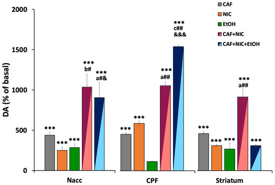 Comparative effects of nicotine (NIC, 5 mM), caffeine (CAF, 5 mM), ethanol (EtOH, 300 mM), and the combinations NIC + CAF and NIC + CAF + EtOH on dopamine levels in the NAcc, PFC, and striatum. The graphs show the synergistic effect of the administration of caffeine together with nicotine in the NAcc and striatum and that the addition of ethanol to this mixture produces an additive effect on the release of dopamine. The values observed are the maximal increases observed in Figure 2, Figure 3, Figure 4 and Figure 5, expressed as a percentage of the basal levels (100%). Significant differences: *** p < 0.001 with respect to basal levels; a p < 0.05, b p < 0.01 and c p < 0.001 with respect to nicotine group; # p < 0.05 and ## p < 0.01 with respect to caffeine group; & p < 0.05 and &&& p < 0.001 with respect to ethanol group.