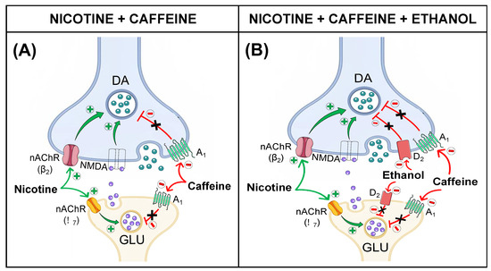 Schematic representation of potential mechanisms underlying the effects of combined administration of (A) nicotine and caffeine and (B) nicotine, caffeine, and ethanol. Abbreviations: DA, dopamine; nAChR, nicotinic acetylcholine receptor; NMDA, N-methyl-D-aspartate receptor; A1, adenosine A1 receptor; GLU, glutamate; D2, dopamine D2 receptor.