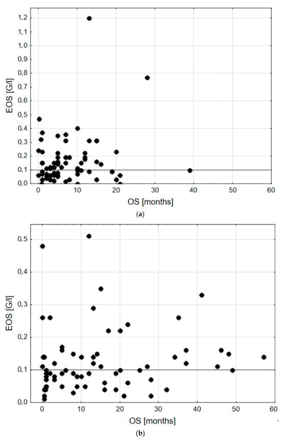 EOS vs. OS distribution in groups according to stage. (a) stage IV and (b) stages I–III. Cut-off point EOS 0.1 G/l was marked with a horizontal black line.