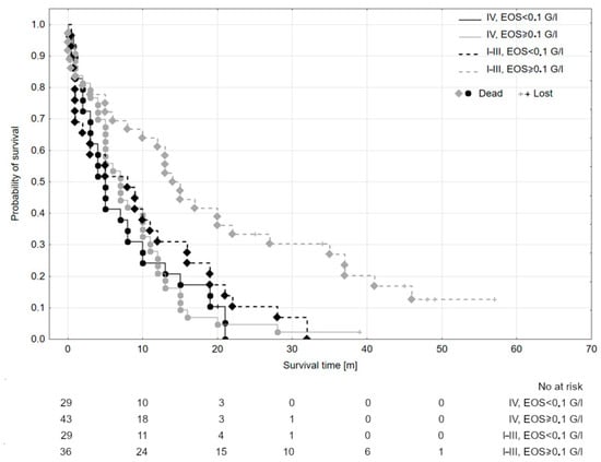 Dividing the whole study population according to two confirmed significant factors—stage and EOS status—led to distinguishing Kaplan–Meier curves for OS with p = 0.024 (Table 5 and Figure 2). Median survival times were decreasing with the increase in EOS and for disease advancement: for stages I–III and EOS ≥ 0.1 G/l: 14.5 months, for stages I–III and EOS < 0.1 G/l: 8.0 months; for stage IV and EOS ≥ 0.1 G/l: 7.0 months, for stage IV and EOS < 0.1 G/l: 5.0 months. The course of the curve for stages I–III and EOS < 0.1 G/ resembles the courses of curves for stage IV groups.