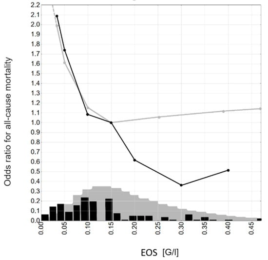 Odds ratios for all-cause mortality: black line—1-year all-cause mortality, current study; black histogram—blood eosinophilia values dispersion in the current study; grey lines—4-year all-cause mortality, Andersen et al.; grey histogram—blood eosinophilia values dispersion in Andersen et al. study; the histograms of blood eosinophilia are included for illustrative purposes—black for the current study and grey for Andersen et al. study [].