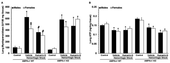 - Klingbeil, L.R.; Kim, P.; Piraino, G.; O’Connor, M.; Hake, P.W.; Wolfe, V.; Zingarelli, B. Age-dependent changes in AMPK metabolic pathways in the lung in a mouse model of hemorrhagic shock. Am. J. Respir. Cell Mol. Biol. 2017, 56, 585–596. [Google Scholar] [CrossRef]