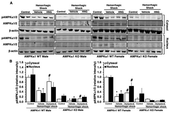 - Wagner, M.L.; Ammann, A.; Piraino, G.; Wolfe, V.; O’Connor, M.; Lahni, P.; Ziady, A.; Zingarelli, B. Protective effects of humanin-G in hemorrhagic shock in female mice via AMPKα1-independent mechanisms. Shock 2023, 60, 64–74. [Google Scholar] [CrossRef] [PubMed]