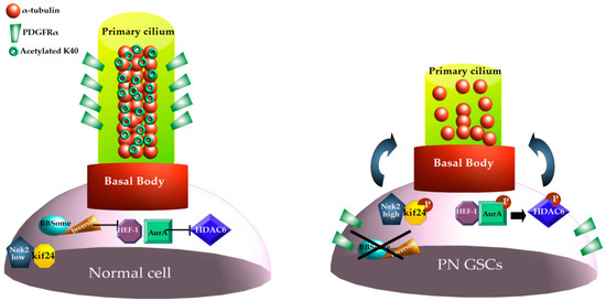 Schematic overview of primary cilia assembly/disassembly and players involved in normal and proneural (PN) glioblastoma stem cells (GSCs).