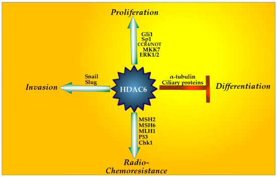 Importantly, HDAC6 has been found to deacetylate and regulate the proteins belonging to the DNA mismatch repair system (MMR), including MSH2 [221] and MLH1. This latter, when deacetylated, impairs the formation of the MutSα–MutLα complex, thereby inducing DNA damage tolerance [222]. This specific HDAC6 activity is particularly important in promoting the chemo- and radioresistance of cancer cells (see below).