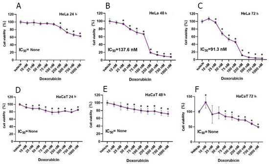 The effect of DOX application on 9 different concentrations obtained by serial dilution in the concentration range of 10-1000 nM in HeLa cervix adenocarcinoma (A–C) and HaCaT human skin keratinocyte cell line (D–F) on compared to the vehicle group and the IC50 value of the chemotherapy agent (n = 6; data are mean ± standard deviation values, inhibition concentration (IC) values calculated by probit analysis). * Data are statistically significant compared to control, one-way ANOVA, Tukey HSD test, p ≤ 0.05.