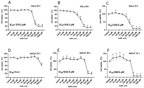 Effect of GA application on 9 different concentrations obtained by serial dilution between 10-1000 µM concentration range in HeLa cervix adenocarcinoma (A–C) and HaCaT human skin keratinocyte cell line (D–F) cell lines for 24, 48 and 72 hours on cell viability compared to the vehicle group and the IC50 value of GA (n = 6; data are mean ± standard deviation values, inhibition concentration (IC) values calculated by probit analysis). * Data are statistically significant compared to control, one-way ANOVA, Tukey HSD test, p ≤ 0.05.