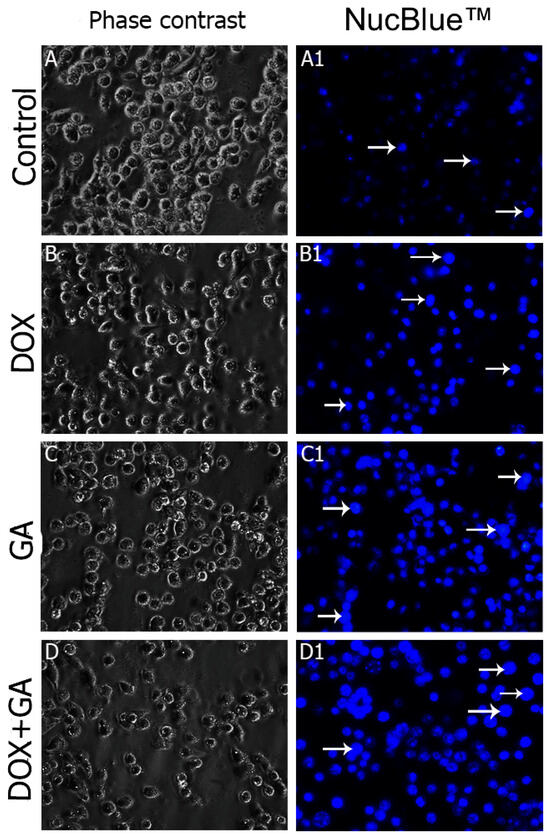 Cell morphology, nuclear structure, and apoptotic body formation (magnification: ×20) in HeLa cervical adenocarcinoma cell populations treated for 48 hours with vehicle control (A,A1), DOX IC50: 137.6 nM (B,B1), GA IC50: 239.2 μM (C,C1), and DOX IC50+GA IC50 (D,D1) (Arrow: apoptotic cell).