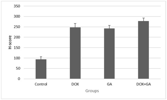 As a result of the calculations, P53 and Bax increased very little in the 48 h control group. Although P53 gene expression was determined at a detectable level in the group in which only DOX was administered for 48 h, it was not statistically significant in the control group. A statistically significant difference was found between the control and DOX+GA and DOX and DOX+GA groups in P53 gene expression. In the DOX group, it was determined that Bax gene expression (RQ = 0.5) was expressed at the highest level with an increase of 50%. Bax gene expression in the DOX-treated group showed a statistically significant difference compared to the control and GA-treated groups. The significance of p ˂ 0.0002 between DOX and the control group and p ˂ 0.0003 between DOX and GA was determined. No statistical difference was found between DOX and DOX+GA groups. When compared with other groups, no significance could be found in P53 gene expression in only the GA-applied group. However, a statistically significant difference was found between the control group and the DOX+GA group in Bax gene expression (Figure 5). It was determined that P53 and Bax protein levels increased significantly with GA and DOX treatment. Especially in the GA+DOX group, the P53 level increased to the maximum, while Bax increased the most in the DOX group (Figure 5).