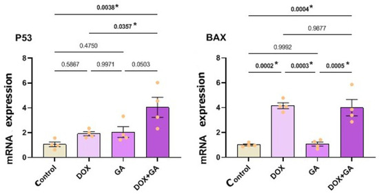 Relative fold increases values of P53 and BAX gene expressions in HeLa cervical adenocarcinoma cell lines, DOX IC50: 137.6 nM, GA IC50: 239.2 μM, 48 h, after single and combined drug administration (data in multiple control with β-actin and GAPDH mRNA level). Method, n = 4 data mean ± SH), * means are statistically different, one-way ANOVA, Tukey HSD test, p values are given in the graph.