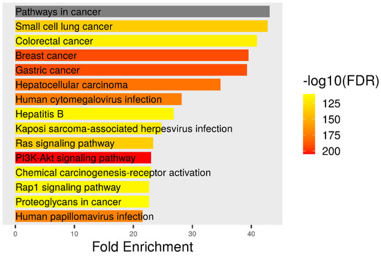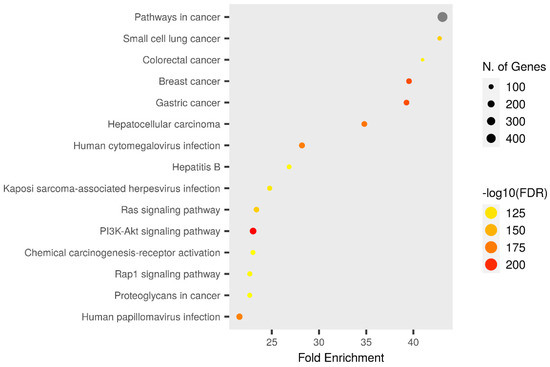 KEGG pathway enrichment analysis of target genes was performed with the Shiny 0.80 program. The findings showed that 530 genes were involved in the enrichment process and 331 pathways were human papillomavirus infection and cervical cancer-related, exhibiting a significant correlation with target genes (p < 0.05) (Figure 7 and Figure 8).
