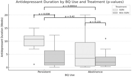 Statistical significance was found across different betel quid use patterns and types of antidepressant treatment. The difference in antidepressant treatment duration between the groups was significant (Figure 2). Furthermore, among the participants with persistent BQ use, SSRI use was significantly associated with treatment duration.