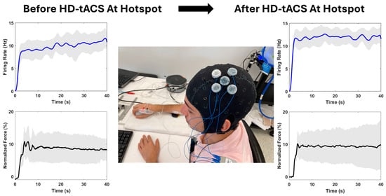 Motor output variability refers to the unintentional differences in the results of voluntary muscle contractions [31]. Examining the variability of the motor output provides valuable insights into motor performance and the recruitment levels of the corticospinal tract and motor units [32,33]. Although the variability of the MUAP firing rate has not been widely used, it is a key factor in force variability during isometric contraction [34]. The results of the current study demonstrated that the variability of the MUAP firing rate decreased on average by approximately 9% after 20 min of tACS treatment, suggesting that the firing of motor units became more synchronized. However, the variability of isometric contraction force increased by approximately 36%. This seems to be counter-intuitive at the first look. It does actually reflect the underlying mechanisms of neuromuscular force control. Before HD-tACS treatment, motor units fire and oscillate at certain frequencies with individual peaks and troughs. When the firing of motor units becomes less variable after HD-tACS treatment, more oscillation peaks of motor unit firing are aligned or become closer. Such synchrony of the oscillation peaks increases the force output [33]. Similarly, the synchrony of oscillation troughs decreases the force output. In other words, the increased variability of total finger force is a behavioral reflection of the decreased variability of motor unit firing. Given that there were no changes in the number of firing motor units and their amplitude and firing rate, the total force remains unchanged. This phenomenon is visually displayed in Figure 1.