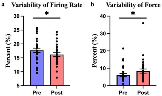 The normality of distributions was assessed using the Shapiro–Wilk test, and the homogeneity of variances was evaluated using Levene’s test and Mauchly’s test for sphericity. When the assumption of sphericity was found to be violated, the Greenhouse–Geisser correction was applied. Two-way repeated measures Analysis of Variances (ANOVAS) were performed to determine the effect of Stimulation_Site (Hotspot vs. C3) and Time (Pre vs. Post) on MUAP_Num, MUAP_Amp, MUAP_FR, CoV_MUAP_FR and CoV_Force. Post hoc tests with Bonferroni corrections were conducted only when significant main effects were observed. All statistical analyses were performed using SPSS 27 (IBM Corp., Armonk, NY, USA), with the significance level set at p < 0.05.
