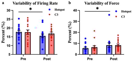 (a) Averaged CoV_MUAP_FR values from the hotspot and C3 before and after the HD-tACS intervention. (b) Averaged CoV_Force values from the hotspot and C3 before and after the HD-tACS intervention. Data are presented as mean ± SE. A single asterisk (*) indicates a p-value < 0.05.