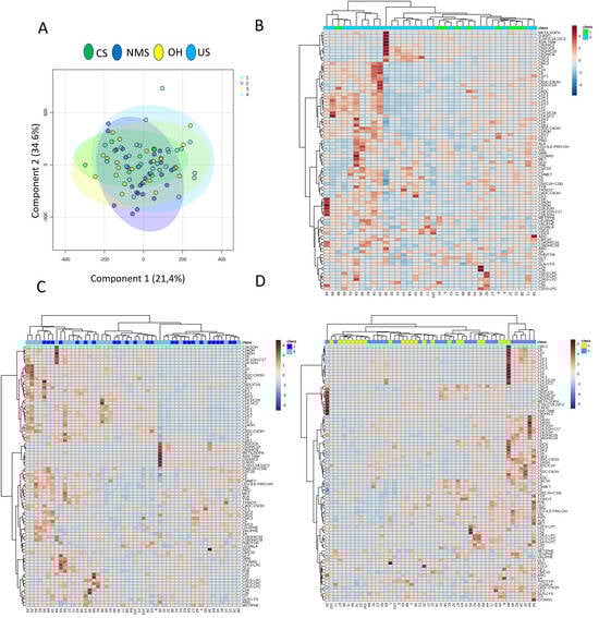 PLDS-DA analysis and heatmaps based on the comparison between each TLC group. PLDS-DA analysis based on the metabolite pattern quantified in the TLC groups, in particular, CS in green, NMS in dark blue, OH in yellow, and US in light blue (A); heatmaps based on serum metabolite levels quantified in CS (B), NMS (C), and OH (D) for evaluation of the US group cluster analysis.