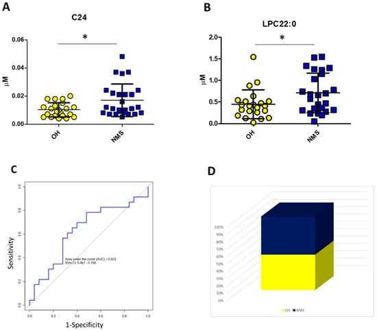 The logistic regression model with C24 and C22:0-LPC. Dot-plot showing plasma levels of C24 (A) and C22:0-LPC (B) in the comparison between the OH and NMS groups; cumulative ROC built by using C24 and C22:0-LPC simultaneously based on a logistic regression model for the comparison between OH and NMS (C); re-classification of US patients based on the application of the logistic regression algorithm described in Table 2 (D). * p-value < 0.05.