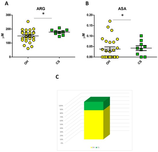 In the same comparison, argininosuccinic acid (ASA) and ARG increased in the CS subgroup (p-value 0.02; p-value 0.04, respectively) [Figure 4A,B]. As shown in Table S9 in the Supplementary Materials, applying the logistic regression model with ASA and ARG plasma levels pooled together, 78% of the US group were clustered in the OH group, while 22% were in the CS group [Figure 4C].