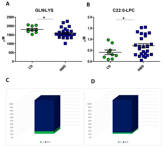 The logistic regression models with GLN/LYS and C22:0-LPC. Dot-plot showing plasma levels of GLN/LYS (A) and C22:0-LPC (B) in the comparison between the CS and NMS groups; re-classification of US patients using GLN/LYS plasma based on the application of the logistic regression algorithm described in Table S10 (C); re-classification of US patients using C22:0-LPC plasma based on applying the logistic regression algorithm described in Table S11 (D). * p-value < 0.05.