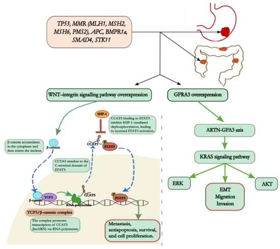 The oncogenic transcription factor STAT3 plays a crucial role in the development and progression of these tumors. STAT3, often overactivated in human cancers, including GI tumors, stimulates the transcription of genes involved in metastasis, anti-apoptosis, proliferation, and survival, thus accelerating tumor growth, metastasis, and drug resistance. Recent research has shed light on the complex interplay between STAT3 and other signaling pathways, particularly the Wnt pathway, in driving GI tumorigenesis [46]. The Wnt receptor ROR1 has emerged as a promising therapeutic target in various cancers. Studies have demonstrated a high frequency of ROR1 expression in several tumor types, including mesothelioma, liposarcoma, GISTs, and uterine endometrioid carcinoma. This finding underscores the potential of targeting ROR1 for the treatment of these cancers [47]. Furthermore, the identification of Wnt-regulated long noncoding RNAs (lncRNAs), such as CCAT5 and CCAT2, has revealed their critical roles in regulating STAT3 activity and promoting tumor development. Specifically, CCAT5 interacts with STAT3, preventing its dephosphorylation and nuclear translocation, thereby accelerating GC progression [48]. Similarly, CCAT2, through its protein-binding properties, influences the alternative splicing of CD44, promoting the progression of GC [49]. The involvement of LBH, a developmental transcription cofactor, further highlights the complexity of the Wnt pathway in cancer. LBH overexpression, observed in a broad spectrum of malignancies, including those affecting the GI tract, is associated with a poor prognosis and suggests its potential as a biomarker for Wnt hyperactivation in cancer patients. These findings highlight the intricate molecular mechanisms underlying GI tumorigenesis, emphasizing the importance of understanding the interplay between STAT3, the Wnt pathway, and lncRNAs [50]. Further research focused on these pathways may lead to the development of novel therapies aimed at disrupting these critical signaling nodes, ultimately improving the treatment of GIC.