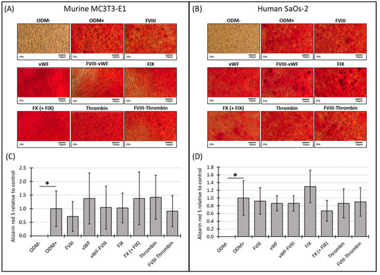 The expression of Alizarin red S relative to cell viability in murine MC3T3-E1 and human SaOs-2 osteoblasts. (A) Murine MC3T3-E1 osteoblasts and (B) human SaOs-2 osteoblasts were incubated for three weeks in αMEM medium supplemented with ascorbic acid (1 mM), ß-glycerophosphate (8 mM), and calcium chloride (5 mM), referred to as osteoblast differentiation medium (ODM+). The negative control (ODM−) lacked these supplements. Cells were exposed to various coagulation factors (FVIII, vWF, vWF-FVIII, FIX, FX, thrombin, and FVIII-thrombin; 1 U/mL each). The levels of Alizarin red S were quantified relative to cell viability and are expressed relative to the ODM+ reference, which was set as 1. Data represent the means ± standard deviation of four independent assays performed in triplicate (n = 3), except for the ODM+ reference and the negative control (ODM−) (n = 6). * indicates a significant difference (p < 0.05).